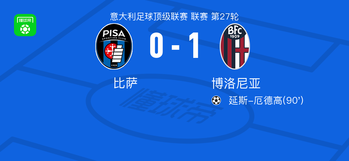 北京时间3月3日意大利足球顶级联赛 联赛 第27轮,比萨主场对阵博洛尼亚。博洛尼亚 延斯-厄德高破门。最终比分比萨 0-1 博洛尼亚。