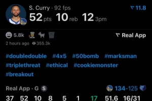 本场比赛,库里出战36分钟,31投16中,三分20中12,罚球8中8,狂轰52分10板8助5断1帽。